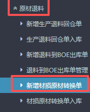 1.进入ERP系统之后,在左侧的功能菜单里找到“BOE定制”,点开“原材退料”,点击“新增材损原材转换单”。