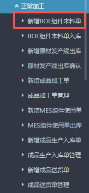 1.进入ERP系统之后,在左侧的功能菜单里下方可以找到“BOE定制”,点击后找到“正常加工”。然后点击打开“新增BOE组件来料单”。2.进入“新增BOE组件来料单”界面后,先填写好基本的信息:入库仓库、收货日期。