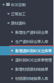 进入ERP系统之后,在左侧功能菜单里找到“BOE定制”,点开“原材退料”,找到“新增退料到BOE出库单”