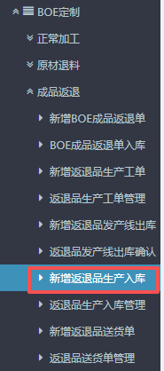 1.进入ERP系统之后,在左侧的功能菜单里找到“BOE定制”,点开“成品返退”,点击“新增返退品生产入库”。
