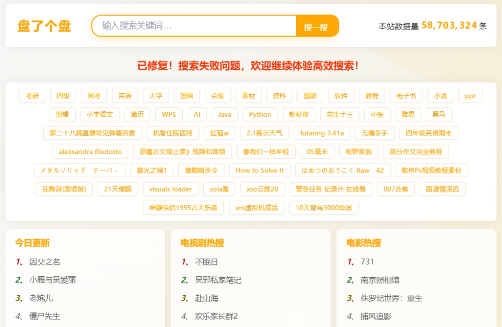 https://www.panlegepan.com​ 🆔网站名称:盘了个盘 ⭐网站功能:网盘资源搜索📁网站简介:一个聚合云盘搜索平台,可以通过该网站快速查找各类学习资料、电子书、软件教程、影视资源等。网站的数据量庞大,涵盖了考研、英语、编程、摄影等多个领域,用户只需输入关键词,即可获取相关资源的链接。🔗网站...