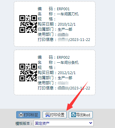 在标签打印页面,点击按钮“打印设置”,就可以更改当前的固定资产标签模板: