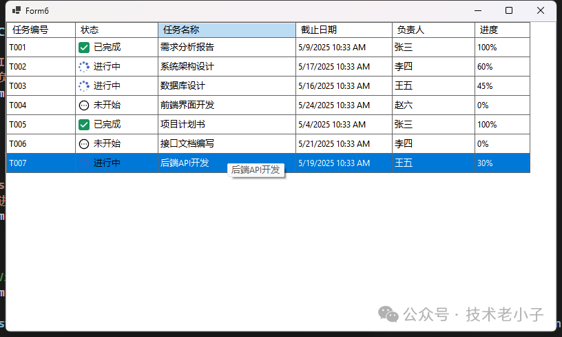 new TaskItem { TaskId = "T007", Status = "进行中", TaskName = "后端API开发", Deadline = DateTime.Now.AddDays(5), PersonInCharge = "王五", Progress = "30%" }
