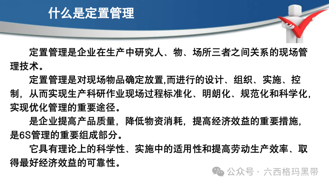 定置管理是研究人、物、场所三者关系的现场管理技术。它通过对现场物品的合理放置和管理,实现生产过程的标准化、明朗化、规范化和科学化。定置管理不仅关注物品的物理位置,还注重人与物的结合效率以及场所的利用效率,是一种全面优化现场管理的方法。