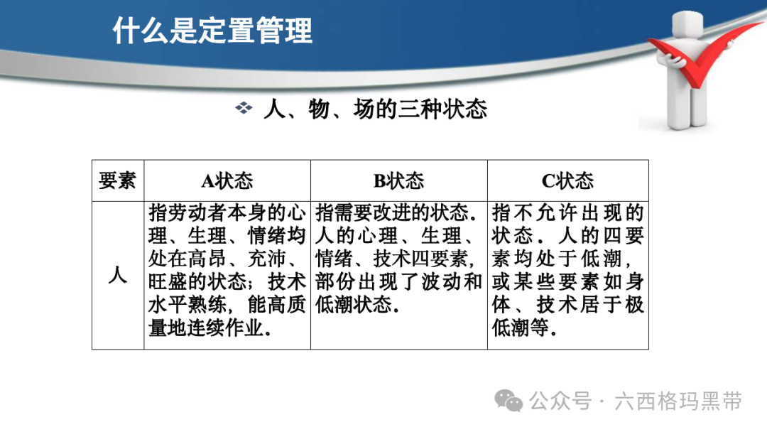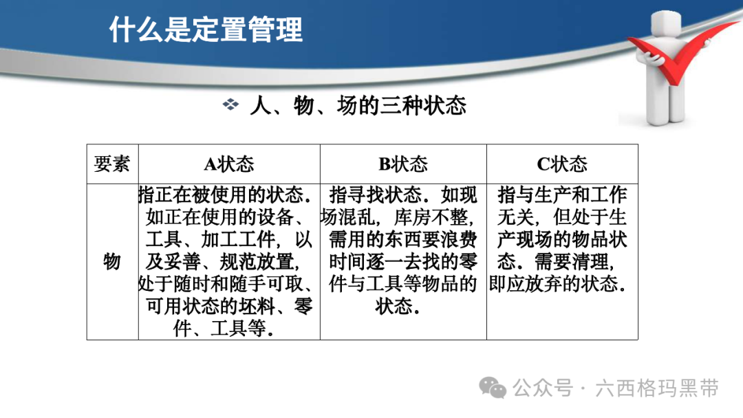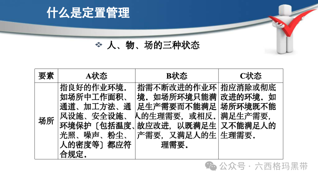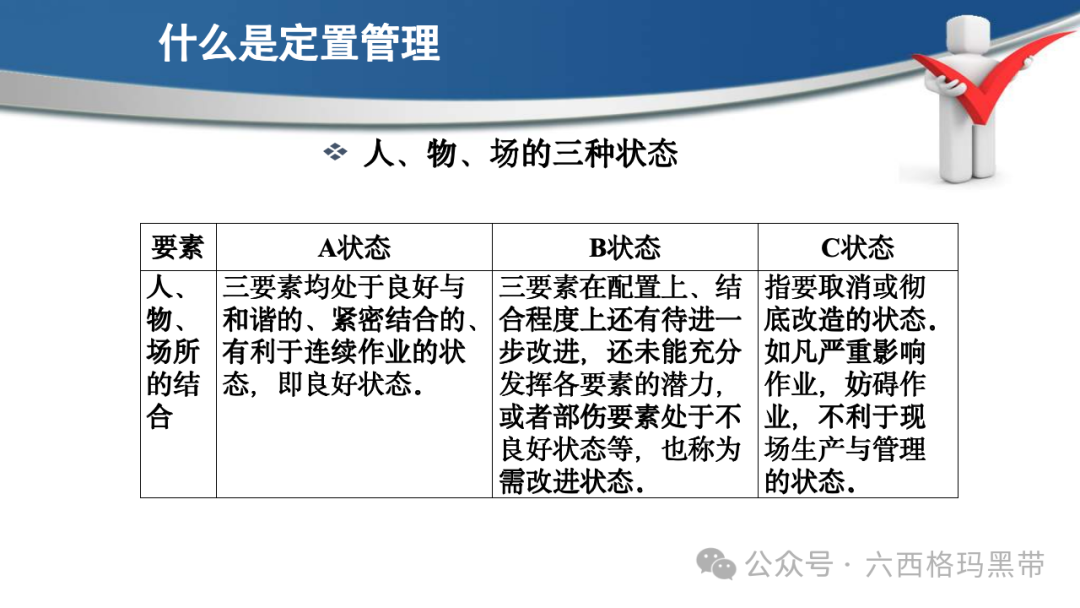 定置管理的要素主要包括人、物、场所及其相互结合的状态。以下是详细说明: