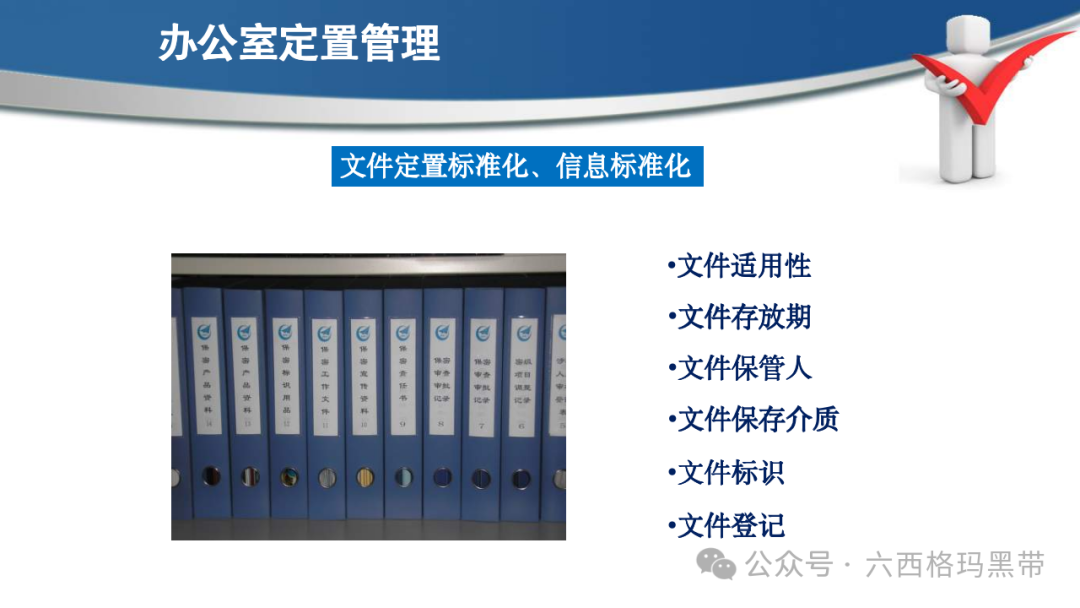 • 文件定置标准化与信息标准化:确保文件的存放和管理符合标准,信息清晰准确。例如,文件应按照项目、类别等进行分类存放,标识清晰。