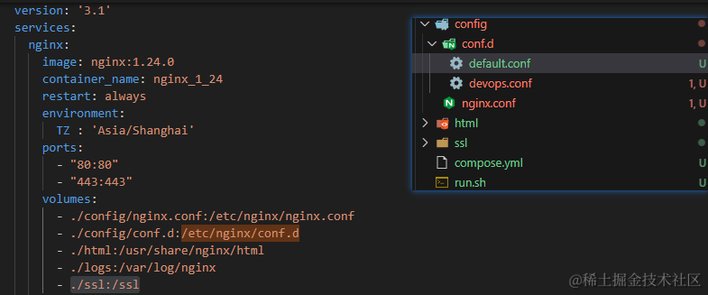 自定义配置 conf.d/default.conf 将前文 Windows 的配置部分修改到 default.conf 如下所示