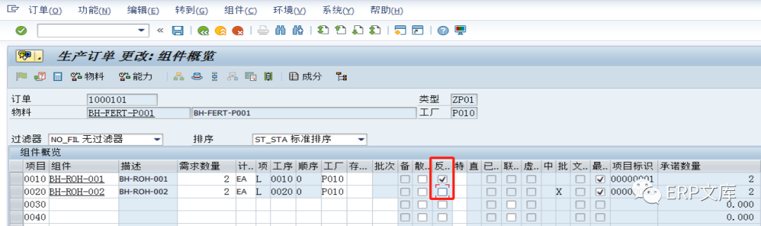生产订单上也可以直接设置物料是否为反冲,如果物料主数据和工作中心都没有设置反冲标识,也可在开生产订单时候手工勾选了反冲(上图),此物料在这订单中也是反冲物料。
