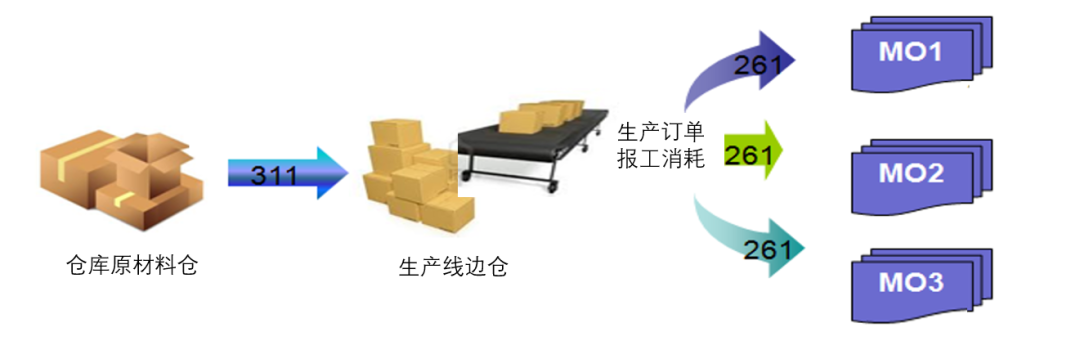 首先使用拉料单(MF60)将原材料从原材料库存地点拉到车间线边仓中(移动类型为311,此时不产生会计凭证),等到生产订单(或者流程订单、计划订单)被确认的时候,相应的物料才被发料过账,产生会计凭证(移动类型为261)。