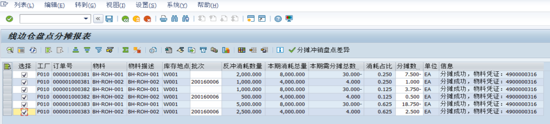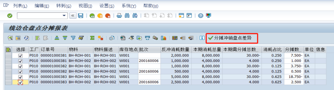 每月定期盘点的数据上传SAP系统,系统计算出差异,然后按一定逻辑将这些差异分摊(执行261或262)到当月有消耗反冲物料的工单上(比如工单的定额消耗的比例进行分摊),通过每月定期盘点,确保线边仓反冲物料相对准确。