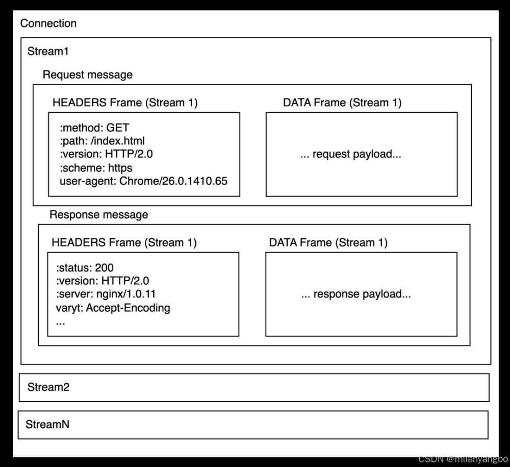 1. Connection(连接):一个TCP连接支持多个并发Stream,减少了HTTP/1.1中多个TCP连接的开销和延迟。