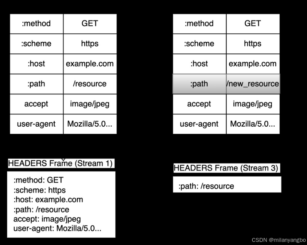 HTTP/2尝试尽可能地最小化有效载荷大小。它将压缩与前一个请求中相同的头。在HTTP/1中,一个连续的请求看起来像是针对不同资源的初始请求。