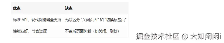 1. 可见性监测:优先使用 Page Visibility API 处理标签页切换场景。