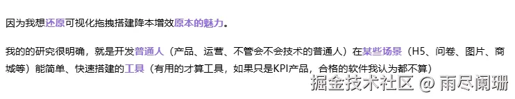 我的结论是,如果那么复杂的场景,物料拖来拖去,逻辑链上百个节点,不如cursor一句话... 这是我的黑历史,也是我的来时路转行前端:低代码熟练工最早受害者我2017年大学毕业,原本学的是Java,在南京面试并入职了一家公司做后端开发。 当时公司招聘了大量应届毕业生,我本以为是因为业务发展迅速,需要大量研发人员。然而入职后才发现,公司后端开发并不使用代码开发,而是通过公司自研的一个逻辑编辑器进行开发。这个编辑器采用拖拽节点、搭建逻辑链的方式来实现后端业务。我们平时写的一句代码,实际上就是一条逻辑链,独立的方法构成一个独立的父节点,节点之间再相互串联。之所以招聘这么多人,是因为公司离职率极高,每年大约只有20%的人能留下来。公司通过这种方式,逐年筛选出逻辑编辑器的熟练工。 我干了两个月后,实在无法适应,准备离职。但当时招聘季已经结束,只能暂时忍耐。转机出现在公司的低代码平台——它只支持后端开发,前端仍然需要编写代码。前端组也在招人,于是我谎称自己会前端,成功转到了前端组。但实际上,我当时只会一点Vue基础,完全不懂前端开发,只能从头学起。最终,我从后端彻底转成了前端开发。 在大半年后,我跳槽去了另一家公司。就在我准备离职时,公司其他部门的前端组也开发出了类似的低代码平台。我试用过,虽然非常难用,很多操作反人类,但公司也打算仿照后端的模式,每年招聘前端应届生,逐年筛选出熟练工。 可以说,我们这波人是国内最早被低代码迫害的那批开发者。因为我亲身经历过,所以我很明确地告诉大家:有些公司开发和推广低代码平台的目的,并不是为了提升业务效率,而是为了替换掉研发人员,转而使用一些廉价的低代码平台的熟练工! 这简直从根源上实现了节流,对他们来说也是增效。 开源之旅:构建我理解的低代码平台了解我的同学可能知道,我是低代码开源项目Mall-Cook和云搭的作者,既然我已受过低代码的迫害,那为什么还要开发低代码? 因为我想还原可视化拖拽搭建降本增效原本的魅力。 我的的研究很明确,就是开发普通人(产品、运营、不管会不会技术的普通人)在某些场景(H5、问卷、图片、商城等)能简单、快速搭建的工具(有用的才算工具,如果只是KPI产品,合格的软件我认为都不算) 五年磨一剑,三代铸巅峰我公司是一家做文旅的小公司,而公司的业务恰好是我低代码项目落地的最佳场景。 在过去的五年,我独立开发了三代低代码项目,在项目我都会开发完成后。都自荐接入公司的实际项目中,通过用户实际使用的反馈,不断的优化和扩展。 H5-Generate我自研第一代低代码平台,当时仿照鲁班花了3个月自己搞了一个H5生成器,用来搭建生成活动页H5。 最初的试水之作,现在看来很简陋、使用体验也一般,也没信心开源出来献丑。不过我接入公司文旅小程序,支持了我们当时拳头产品数百个活动页的搭建。 Mall-Cook自研第二代低代码平台,突破只能搭建H5的桎梏,支持搭建H5、小程序、APP任意端页面搭建。 开源地址: 链接 Mall-Cook旨在开发一个供运营、产品快速搭建商城的可视化平台。其实现了可视化页面搭建、组件流水线式标准接入、搭建页面多端生成(H5、小程序、APP)、运营/产品低学习成本维护等特点。 Mall-Cook是我承上启下的开发项目,在项目开发完成后,在当时我还是比较满意的。 所以把项目进行了开源,并向公司自荐由Mall-Cook替换掉H5-Generate,支持公司后续项目的可视化搭建需求 Mall-Cook在开源和公司都取得了很不错的成绩,真正让普通人去做了部分研发需求做的工作,真做到了我所希望的降本提效。 云搭自研第三代低代码平台,大成之作,云搭万物,触手可及! 云搭平台: 链接 开源地址: 链接 介绍文章: 链接 云搭是一款功能强大的可视化搭建解决方案,它支持零代码搭建小程序、H5、问卷、图文文章等多种应用,致力于提供一套简单、便捷、专业、可靠的多场景可视化搭建平台。 我愿景是让所有用户(无论会不会技术的普通人),使用云搭可以简单、便捷搭建各种应用。 平台功能