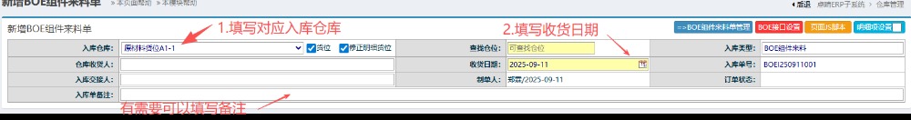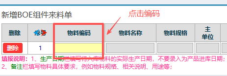然后点击打开“新增BOE组件来料单”。 2.进入“新增BOE组件来料单”界面后,先填写好基本的信息:入库仓库、收货日期。 以及有需要的话可以根据情况填写来料的备注信息。 3.填写BOE组件来料单的信息,首先点击“物料编码”,接着就会弹出查询物料的窗口。 按照图里的顺序在物料大类选择“原辅料”,然后点击查询(如果找不到的话可以填写对应的编码和名称)。