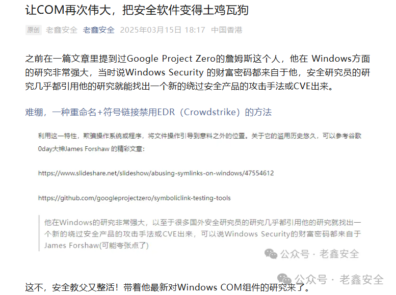 符号链接:Windows系统中的隐形攻击通道符号链接在 Windows 系统中的存在,几乎与系统自身的历史一样悠久。而基于符号链接的漏洞利用技术,也早已不是新鲜事物——早在 1999 年,安全研究员大佬 James Forshaw 就在其分享中首次系统性地揭示了这一攻击思路(参见:https://www.slideshare.net/slideshow/abusing-symlinks-on-windows/47554612#34)。 自此之后,该技术被众多研究人员深入挖掘、不断完善,直至今天,依然是提权漏洞中的“常青树”。几乎每年都有大量相关 CVE 被披露,可以说,它始终在权限提升的战场上反复横跳,从未退场。 虽然这项技术早已被安全界所知,也有不少前辈研究过,不过到今天都很少见到有安全课程或文章真正系统地讲解它们。 说实话,我对主流热门的安全课程竟然忽视了符号链接滥用这一东西感到一些惊讶。 正因如此,决定写下这篇文章。不过今天要聊的,可不是提权那点事儿。 我们要解锁一个更带感的实战场景——如何用符号链接玩转“白加黑”攻击,甚至直接致盲 EDR。 其实早在之前,我就发过相关内容: 难绷,一种重命名+符号链接禁用EDR(Crowdstrike)的方法 具体参考Avast Free Antivirus 的任意文件删除到权限提升:https://www.zerodayinitiative.com/blog/2024/7/29/breaking-barriers-and-assumptions-techniques-for-privilege-escalation-on-windows-part-1 为了便于理解,这里大概解释下: 我们来看看下面这段伪代码Demo: