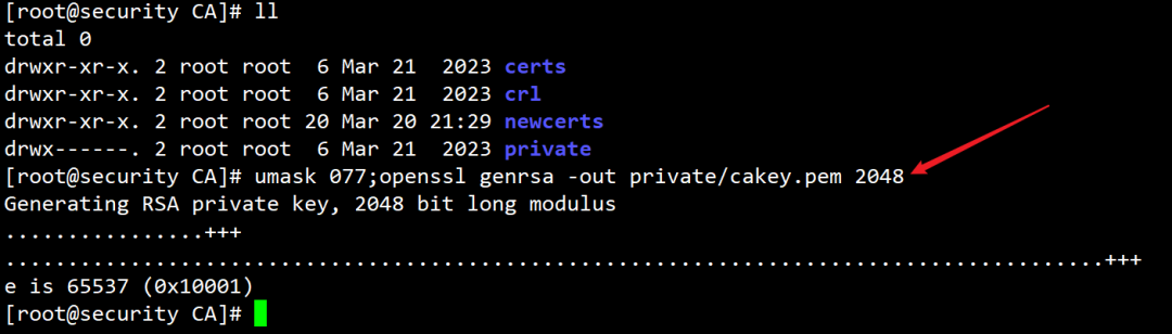 3、执行如下命令生成根证书并且创建两个文件,分别是index.txt和serial,index.txt使用touch创建即可,serial中输入01。openssl req -new -x509 -key private/cakey.pem -out cacert.pem -days 3650