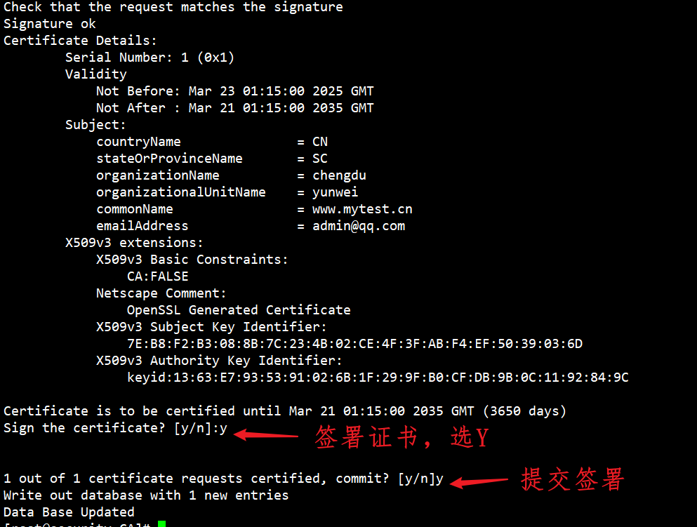 5、用之前生成的CA证书对证书签署请求进行签名,得到服务端证书openssl ca -in /usr/ssl/server.csr -out server.crt -days 3650