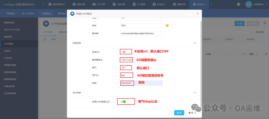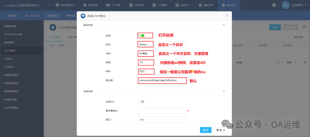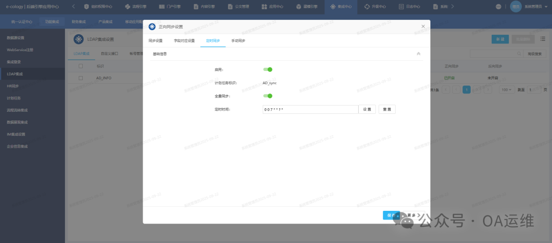 本次记录AD账号同步到泛微OA系统并开启LDAP认证的操作过程,逐步说明操作路径、LDAP集成的基础配置步骤,以指导完成相关集成与认证设置。
